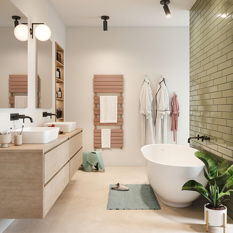 Zejména v koupelně jsou radiátory silně ovlivněny stříkající vodou a vodní parou vznikající při sprchování. Proto jsou radiátory vyrobené z nerezové oceli, jako je například Zehnder Subway, obzvláště vhodné do vlhkých místností. Zejména pokud je radiátor instalován v koupelně relativně blízko toalety, doporučujeme z hygienických důvodů instalaci nerezového radiátoru.