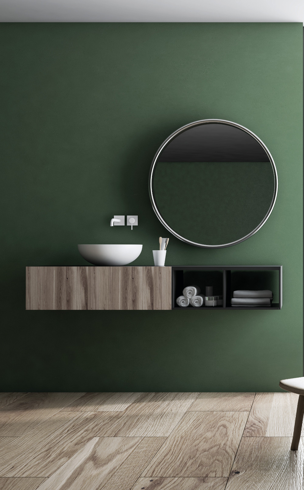 Zelené tóny vyvažují naši touhu po větším zastoupení přírody v našich životech. Stěny a podlahy, ale také textilie a dekorace se objevují v odstínech zelené. Jemně mátová nebo petrolejově zbarvený grafit jsou odrazem naší touhy po přírodním prostředí. Tělové odstíny, světle hnědé a šedé tóny navozují harmonii a klid.