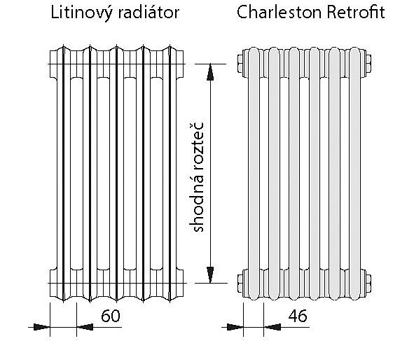 Zehnder Charleston Retrofit umožňuje jednoduchou náhradu litinového radiátoru nebo výměnu starého radiátoru za nový. Díky shodné rozteči bočního připojení lze Charleston Retrofit namontovat na stávající rozvody bez velkých stavebních úprav.