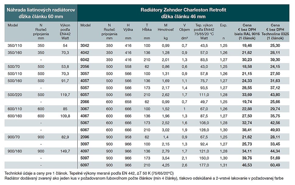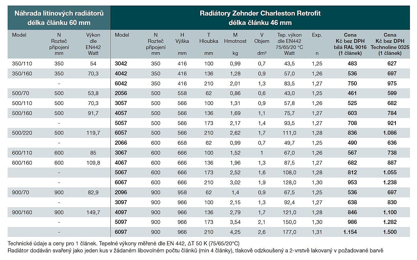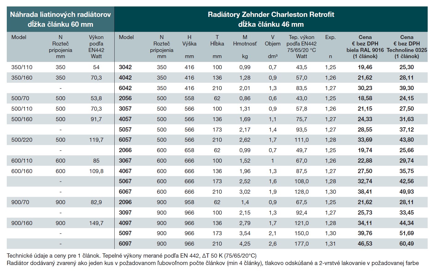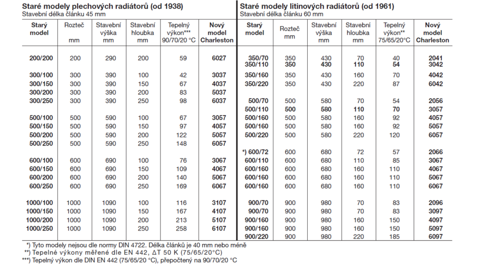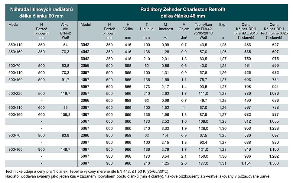 Tabulka obsahuje přiřazení vhodných modelů Zehnder Charleston Retrofit k ocelovým a litinovým článkovým radiátorům, které mají být nahrazeny. Změna rozvodu připojovacích trubek není v tomto případě nutná.