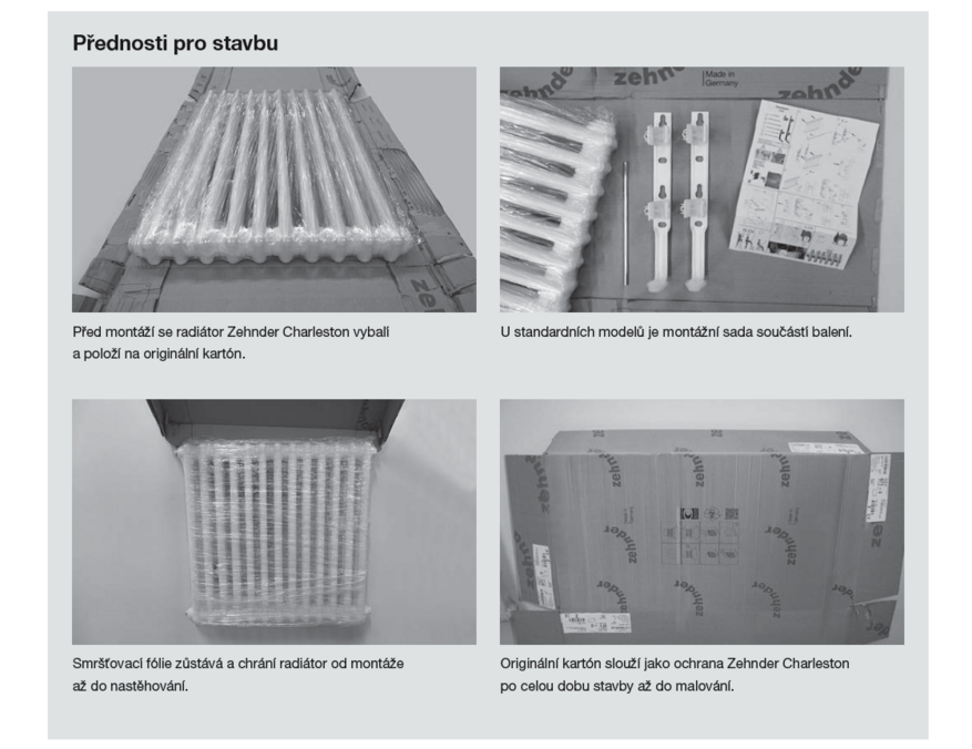 Robustní kartonové obaly zabraňují jakémukoli poškození při dopravě a chrání radiátor po celou dobu stavby až do malování. Ochranným prvkem při instalaci je také smršťovací folie, která se odstraňuje až při stěhování.