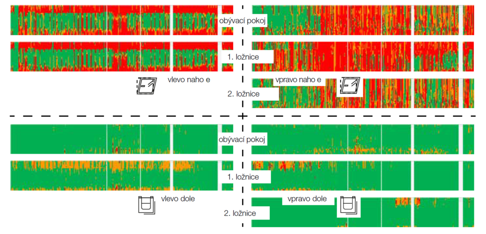 Obrázek 4) znázorňuje hodnoty CO2 všech sledovaných místností jako kobercové grafy. Tyto grafy ukazují, v jakou denní dobu a v jaké sezóně je kvalita