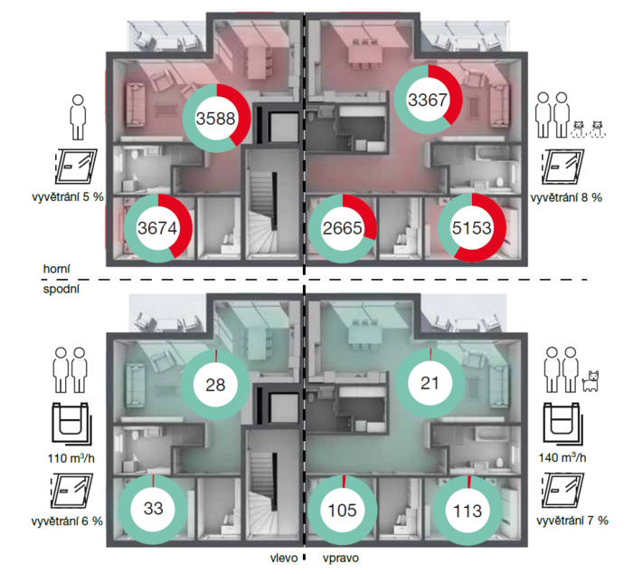 Porovnání kvality vzduchu v místnosti ukázalo, že spodní byty s řízeným větráním mají mnohem lepší kvalitu vzduchu v interiéru než horní byty, kde se větrá manuálně okny. Při pohledu na hodnoty CO2 jsme prokázali, že obyvatelé s řízeným rovnotlakým větracím systémem žijí v mnohem zdravějším prostředí.