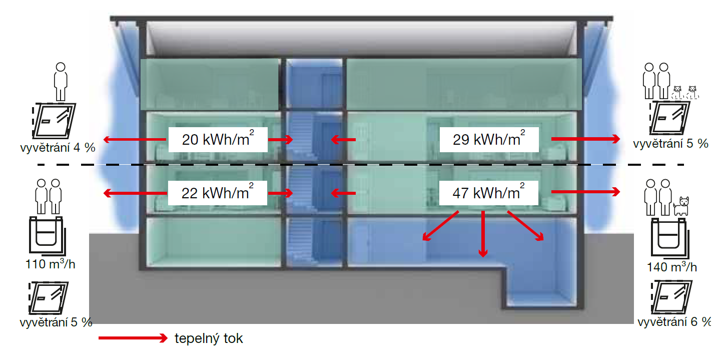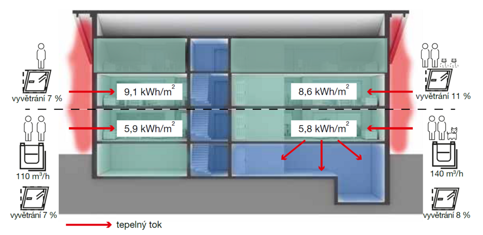 Monitorované využití vytápění a chlazení bytu závisí na faktoru vyvětrání. To je logické, protože venkovní vzduch přicházející oknem musí být přizpůsoben požadované teplotě.