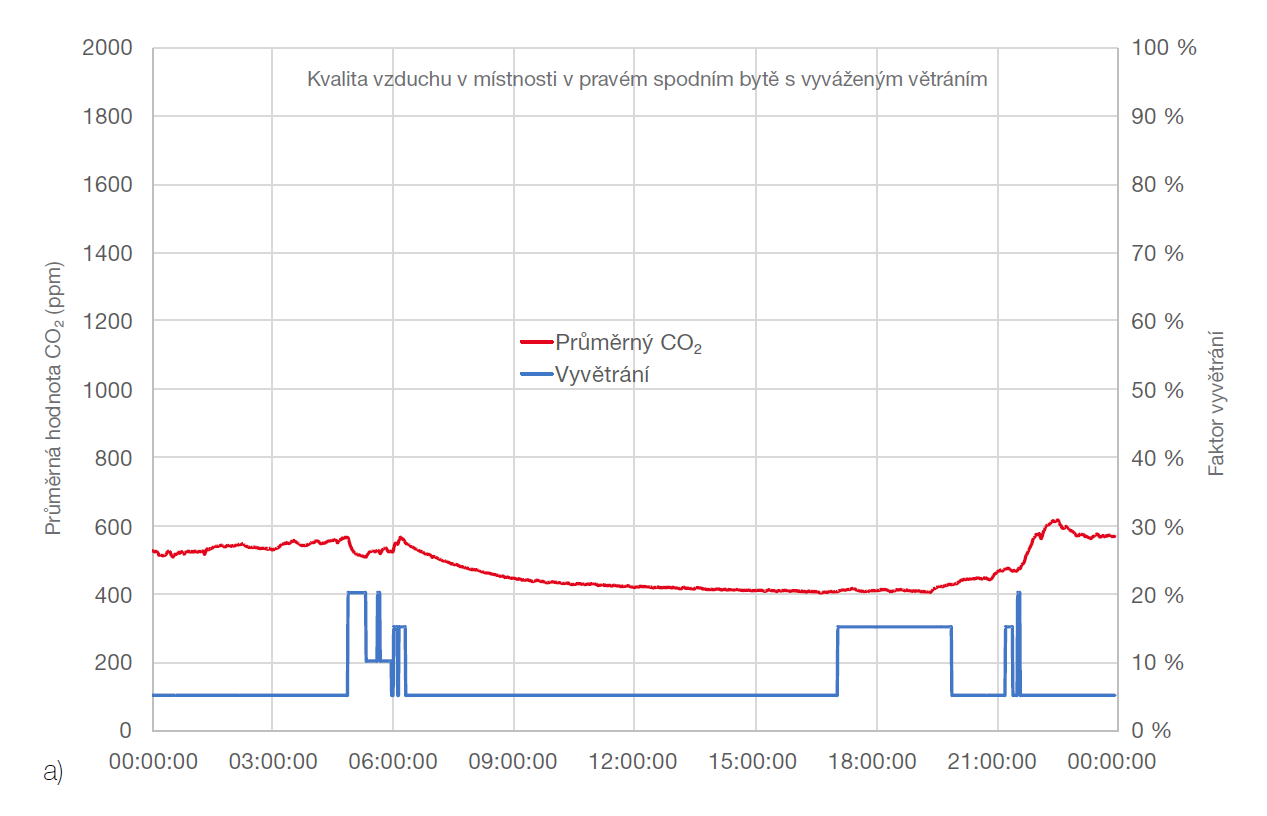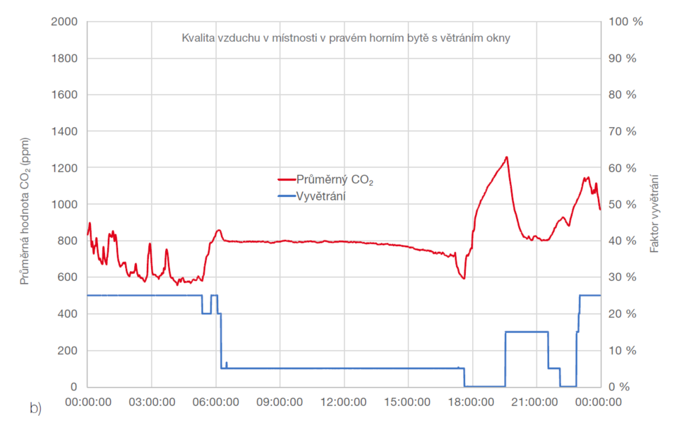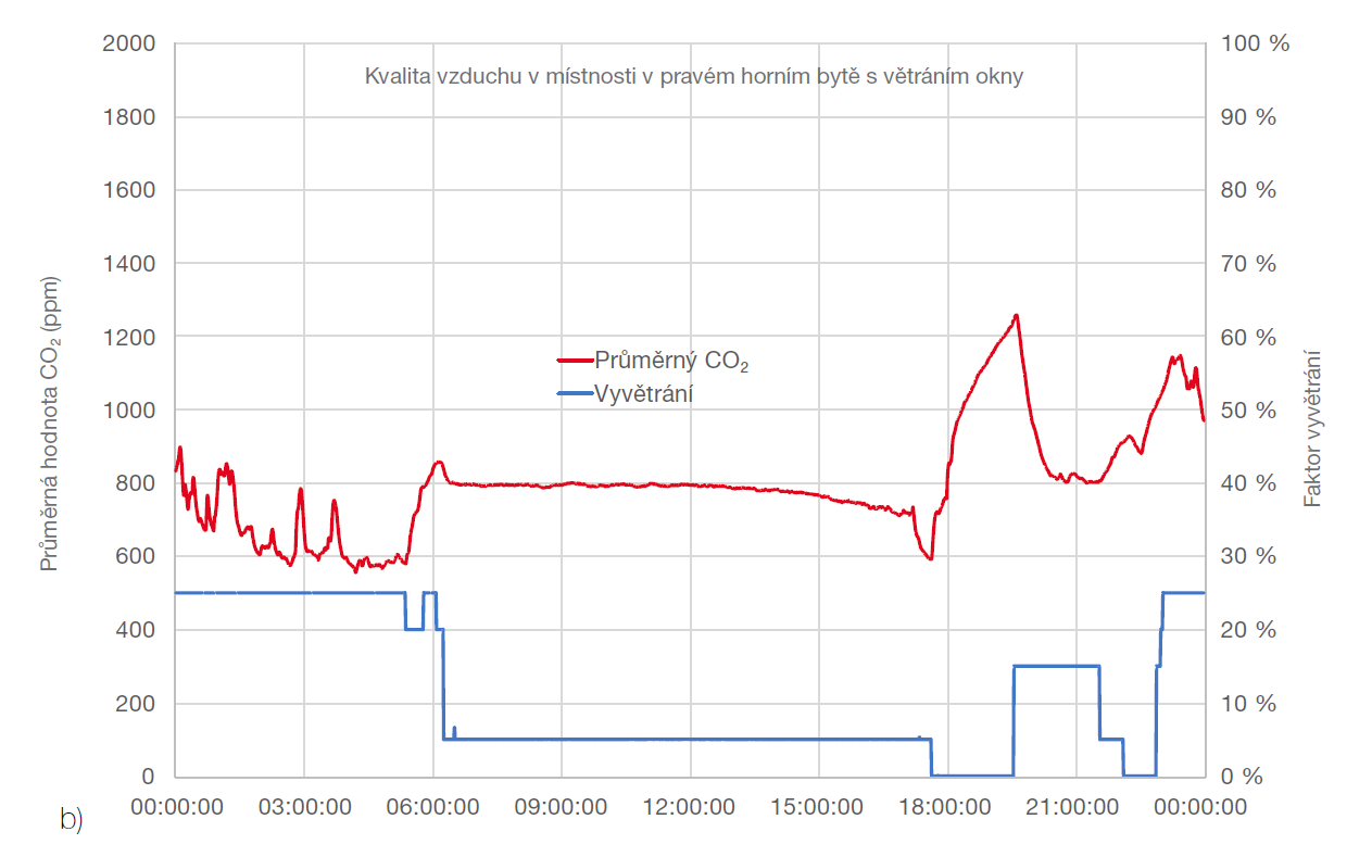 Jak ukazuje obrázek níže, byt s řízeným větráním (a) má v obývacím pokoji a ložnici průměrnou hodnotu CO2 od 400 do 600 ppm. Během noci se obsah CO2 zvyšuje. Během dne jsou obyvatelé bytu pravděpodobně v práci, ale větrací systém pokračuje ve výměně/obnově vzduchu. V důsledku toho průměrná hodnota oxidu uhličitého v bytě klesá z téměř 600 ppm na 400 ppm. Večer se hodnota CO2 mírně zvýší. Průměrná kvalita vzduchu v místnosti je nicméně v průběhu dne dobrá.