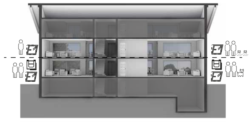 Horní byty jsou větrány okny. Větrání dvou spodních bytů zajišťuje větrací jednotka Zehnder ComfoAir Q350. Jednotky ComfoAir Q jsou vybaveny entalpickým výměníkem, který vyměňuje teplo a vlhkost mezi přívodním a odvětrávaným vzduchem. Všechny dveře a okna lze otevřít.
