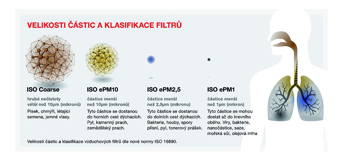 Podle starší normy EN 779 byly vlastnosti filtrů měřeny pouze pro částice o velikosti 0,4 μm. Nový standard nyní rozlišuje čtyři třídy filtrů a zajišťuje, že při měření jsou zohledněny různé velikosti částic. Konkrétně to znamená: Nyní jsou klasifikovány i ty nejmenší částice ve vzduchu a vy se můžete lépe rozhodnout, který vzduchový filtr je pro vás ten pravý.