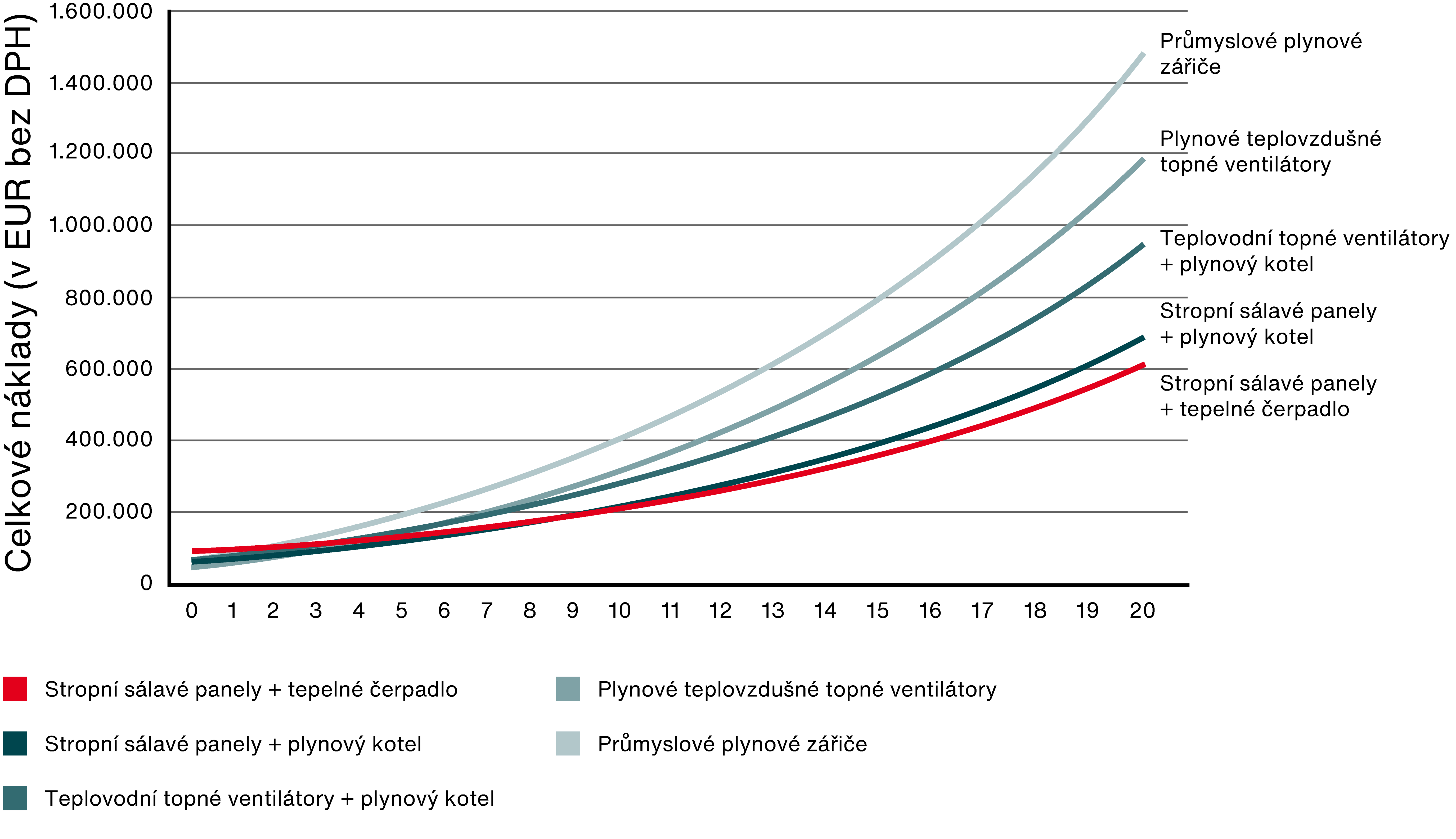 Za necelé 3 roky se díky nižším variabilním nákladům stropních sálavých panelů s tepelnými čerpadly vrátila vyšší investice ve srovnání s průmyslovými plynovými zářiči. Po 15 letech životnosti ušetří stropní sálavé panely s tepelnými čerpadly až 55 % nákladů na jiné topné systémy. Nasazení stropních sálavých panelů s plynovými kotli ušetří až 50 % nákladů.
