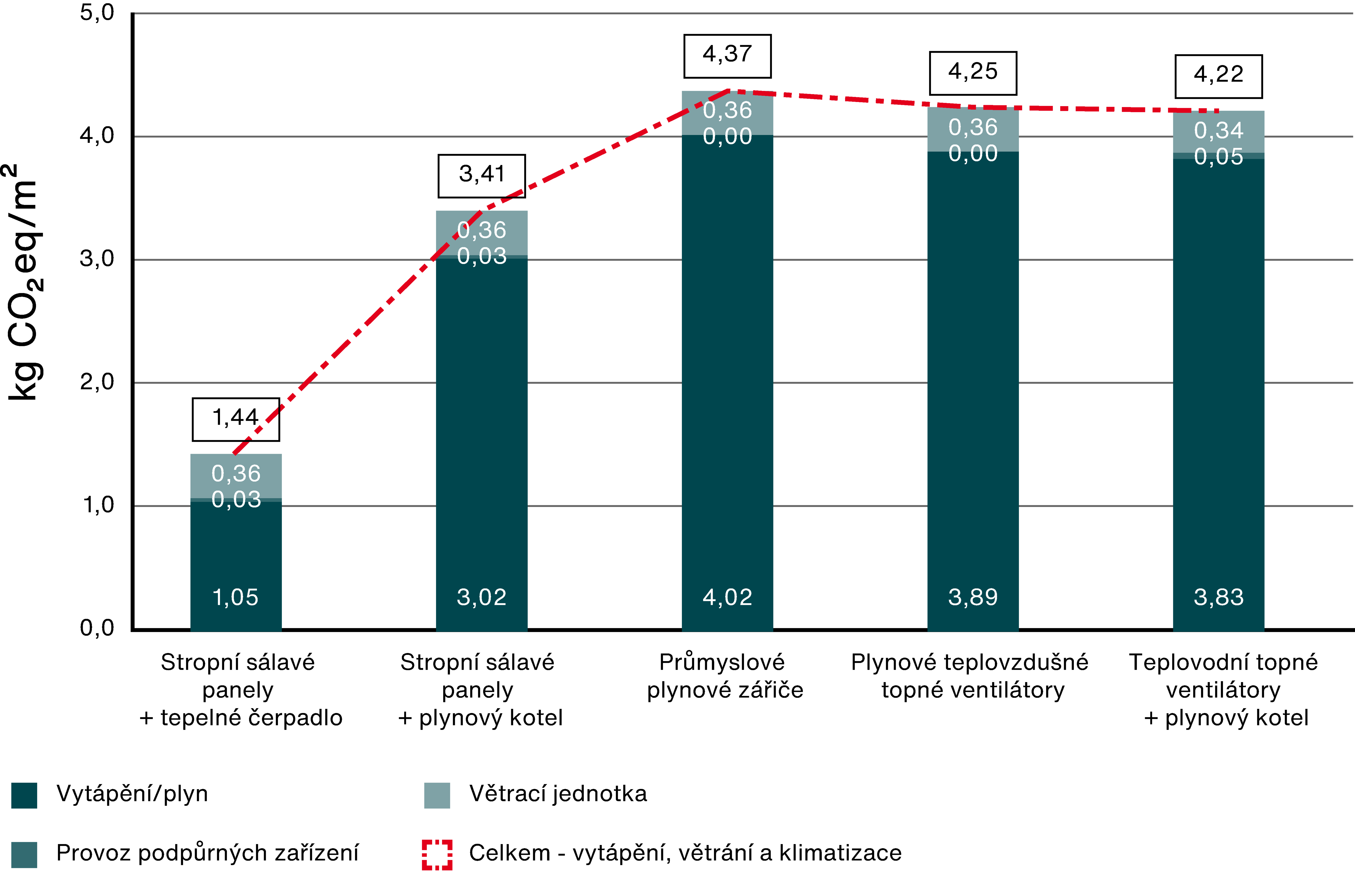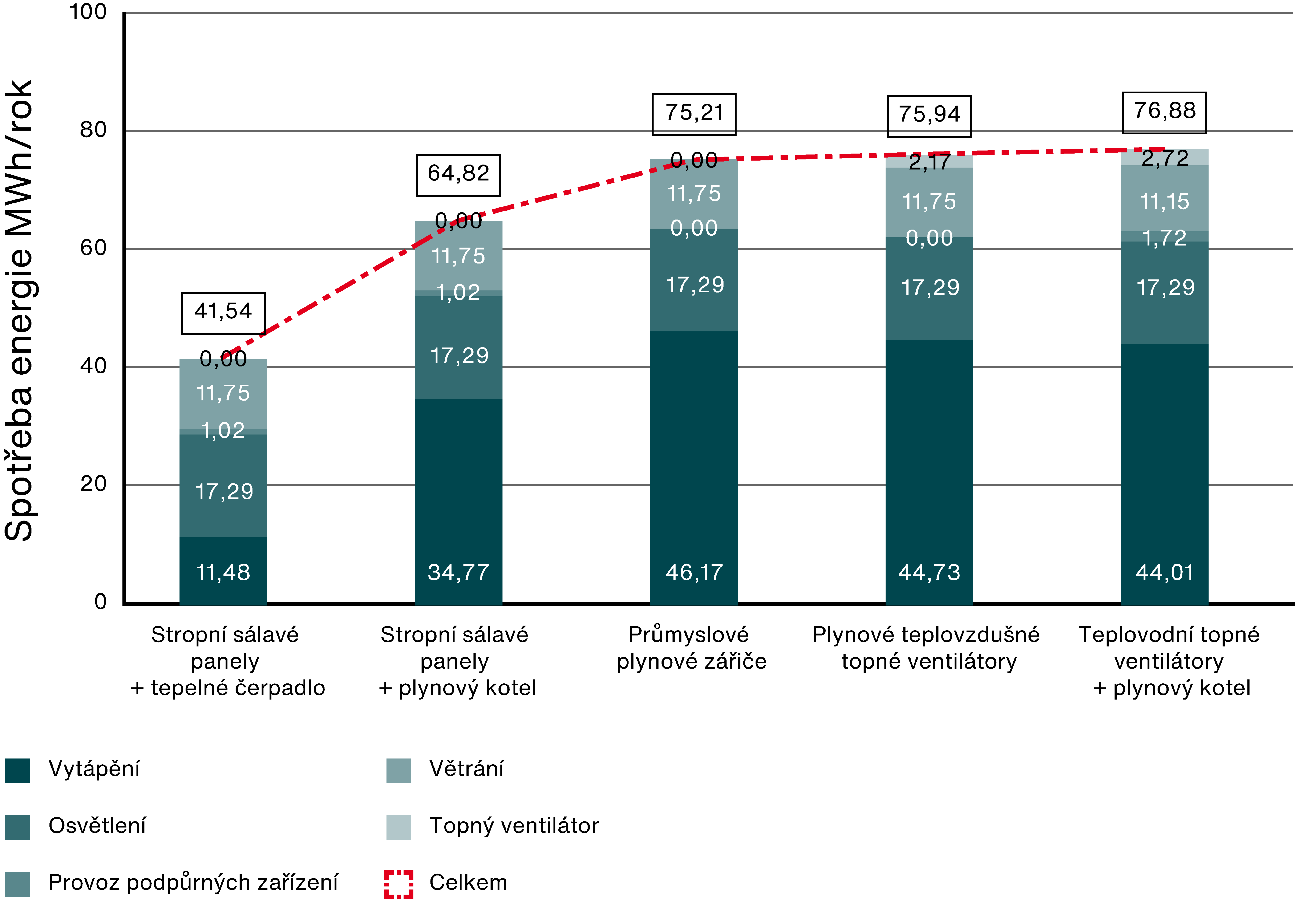 Energeticky nejúčinnějším systémem vytápění jsou stropní sálavé panely v kombinaci s tepelnými čerpadly. Snižují spotřebu energie až o 45 % ve srovnání s jinými systémy.