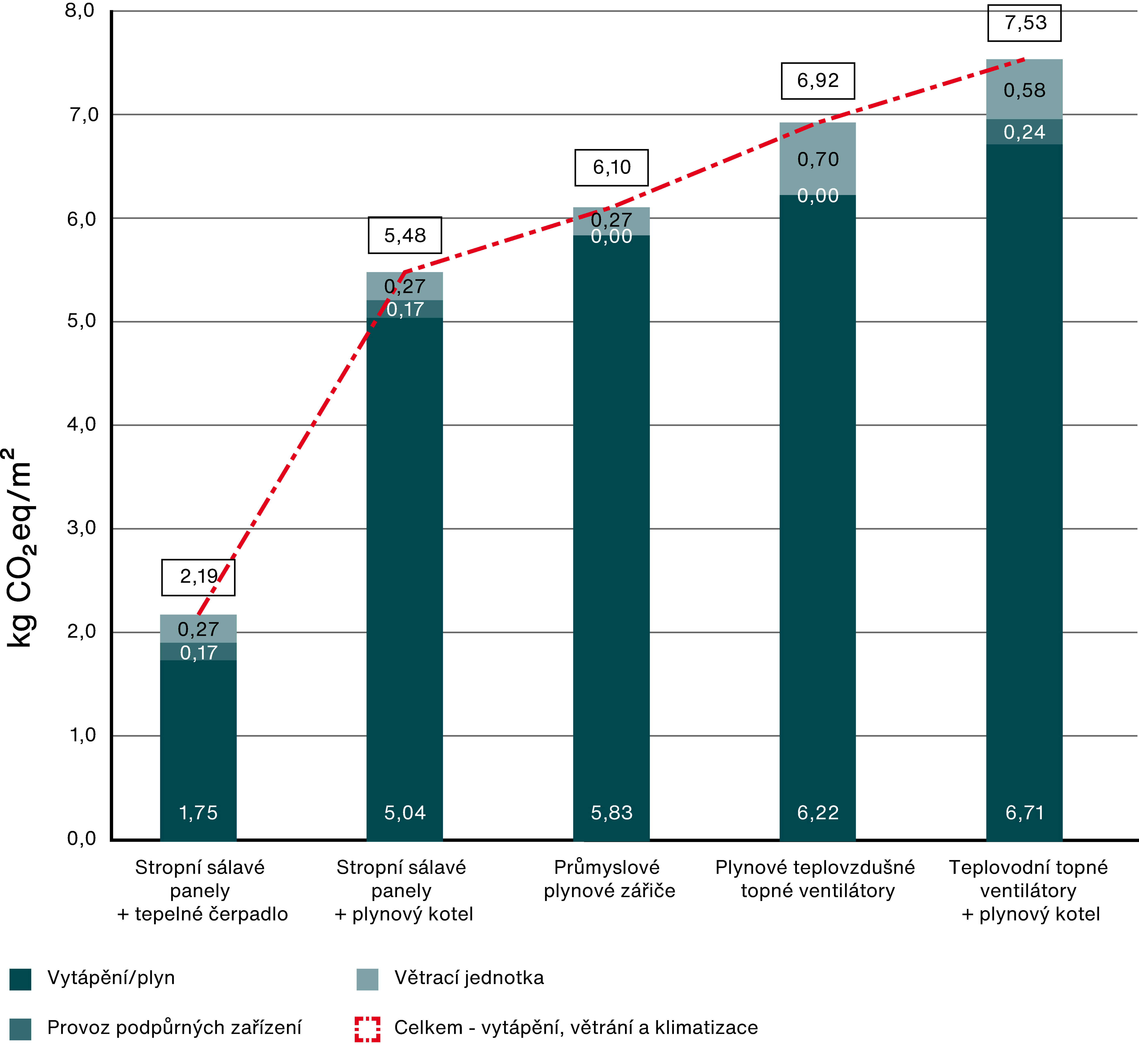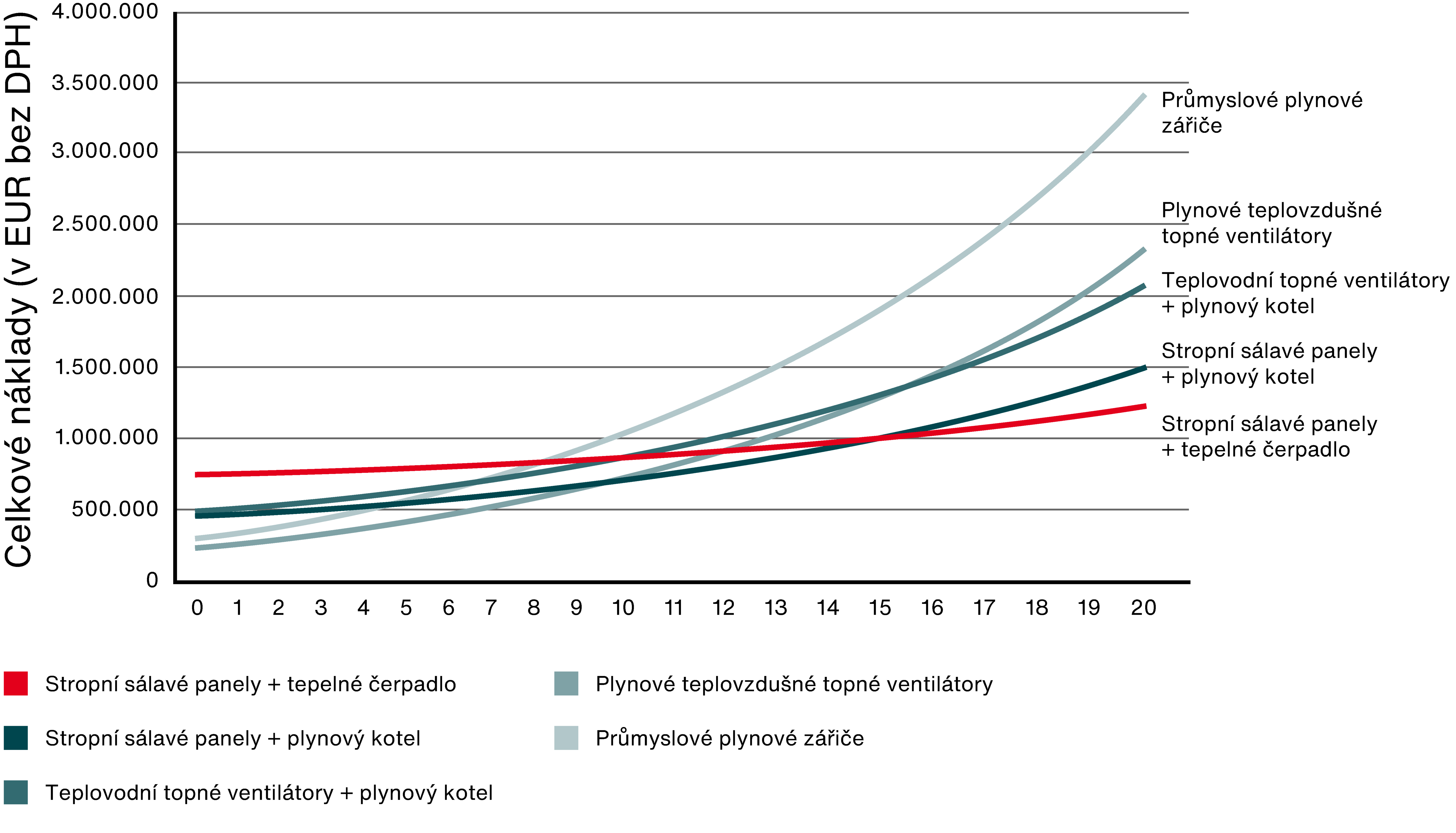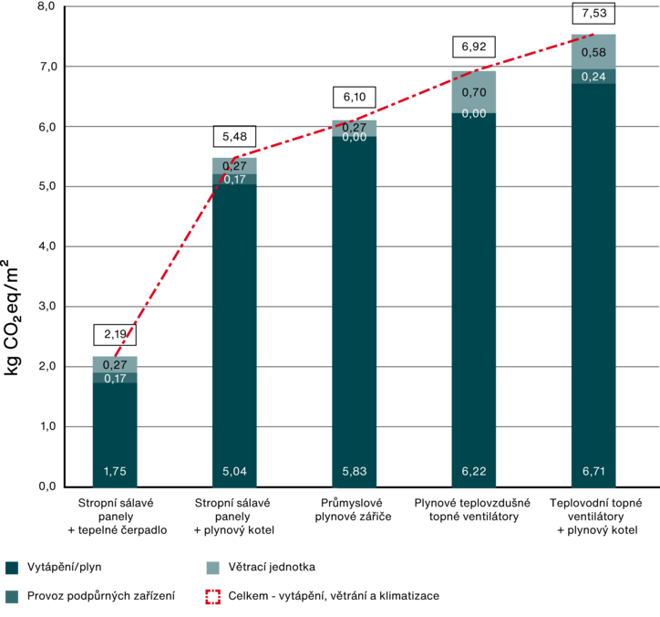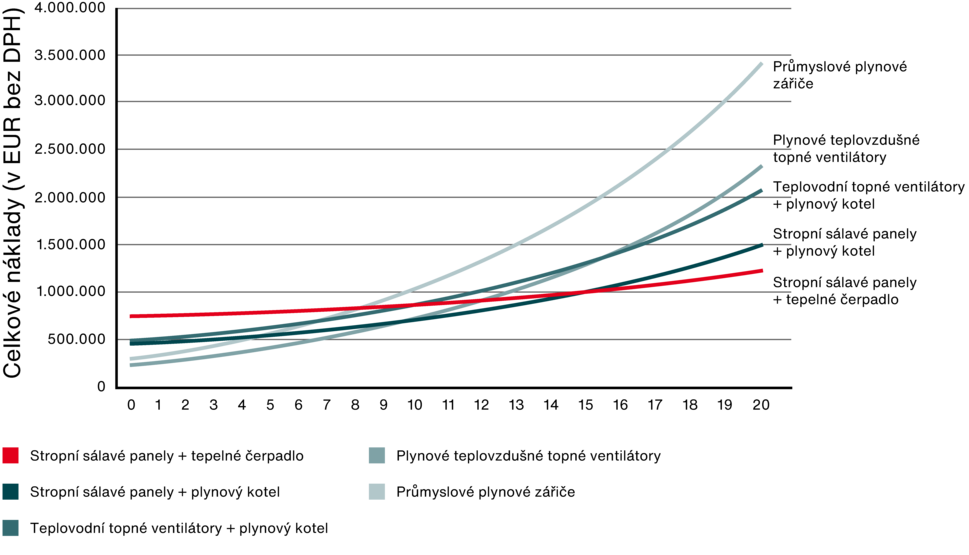 Nejvyšší investiční náklady jsou spojeny se stropními sálavými panely ve spojení s tepelnými čerpadly. Naopak nejnižší počáteční investice se týkají VZT jednotek s plynovým ohřevem.